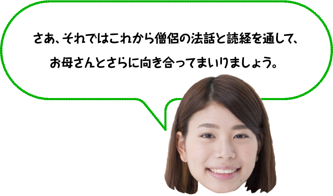 最後にこの時間では、僧侶による読経、法話を通して胸の奥に眠っていた故人さまの言葉と出会い直すことができます。 故人さまを仏さまとして拝むことで、あらたに見えてくることがあるのです。